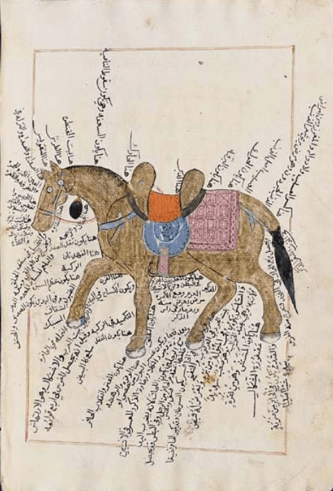 Try to google “horse anatomy”, and I promise you that this manuscript will appear in the search results. This Egyptian manuscript is an anatomical study of the horse conducted in the 15th century during the reign of the Burji Mamluks (1382-1517 CE). The version uploaded on the internet is originally scanned from the book Islamic Science: An Illustrated Study written by Seyyed Hossein Nasr, a professor of Islamic studies at George Washington University. The original version is found in University library in Istanbul, Turkey. Being outstanding cavaliers and valiant warriors, the Mamluks cherished the Arabian horse and considered it to be precious possession, life savior and companion, and a detrimental element in achieving victory in wars. History records Sultan Al-Nasir Muhammed Ibn Qalawoon (1290-1342) importing numerous Arabian horses to his Al-Naseri stud which kept a record of the purchases of the Sultan with each horse’s description and abilities.
