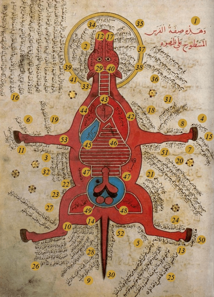 No wonder that such devotion and love motivated the veterinarian (whose identity is unfortunately unknown) to conduct an anatomical study of the “drinkers of the wind”. Actually the medieval Islamic veterinary medicine covered many aspects of caring for horses including exercise, physiology as well as deformities, diseases and their