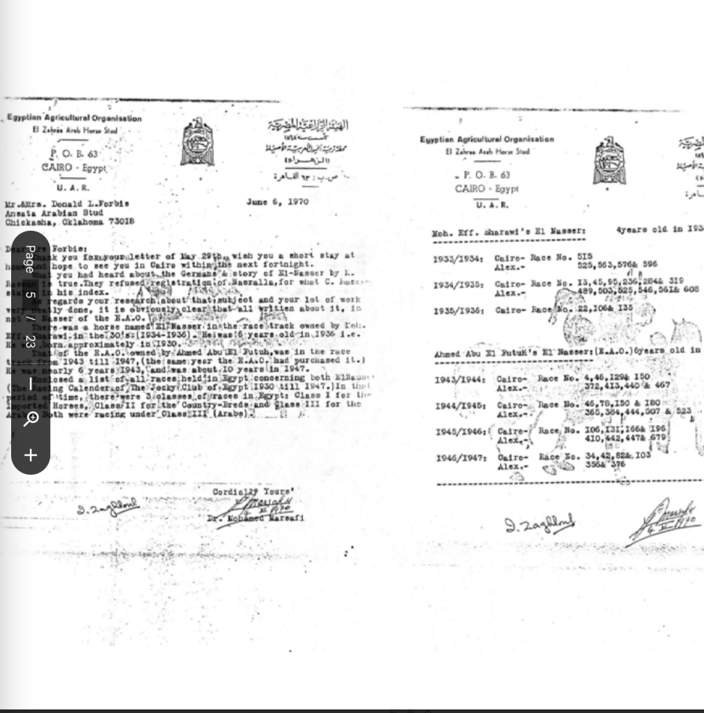 In 29/05/1970, Judith Forbis sent a letter to Dr. Mohamed El Marsafi inquiring about El Nasser RAS, whose date of birth conflicted with El Nasser listed in Carl Raswan’s Index. On 06/06/1970, Dr. Mohamed El Marsafi consulted the calendars of Egypt’s Jockey Club from 1930 to 1947. In his reply, he mentioned two Arabians named El Nasser. One of them was El Nasser, Nasralla’s grandsire, while the other was owned by Mohamed Eff. Shaarawi.
